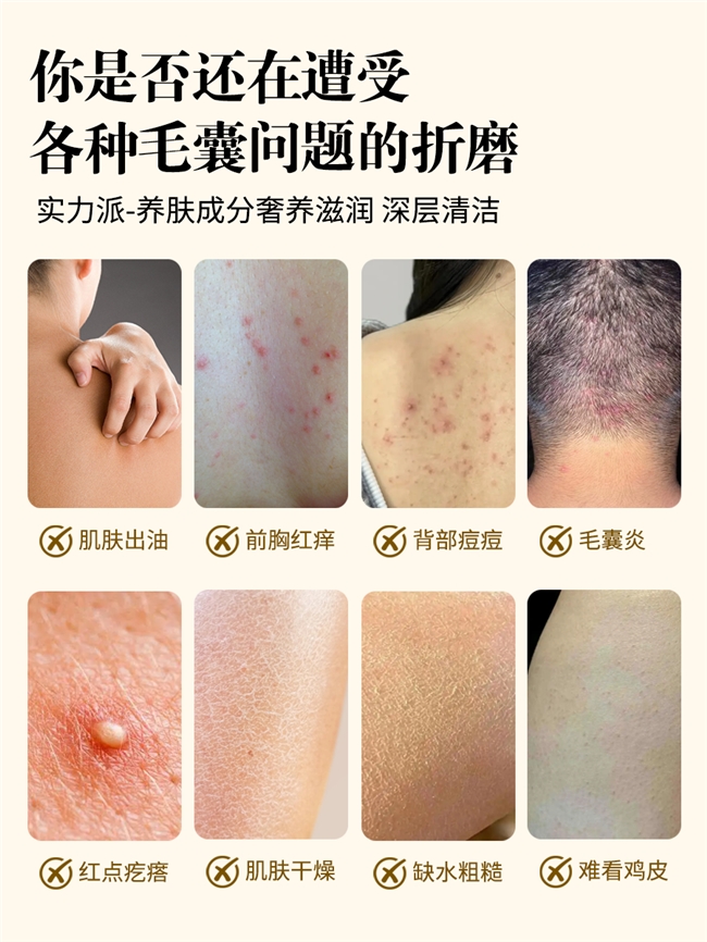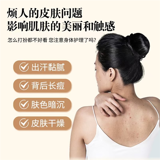 核心定位:专为追求便捷高效、渴望改善粗糙鸡皮肤、前胸后背痘的人群设计,通过构建“深层清洁-角质软化-祛痘修护-滋养锁水”的协同体系,实现无需额外护理、日常洗护即可改善肌肤粗糙、清除痘痘的目标,适配全肤质日常便捷使用。