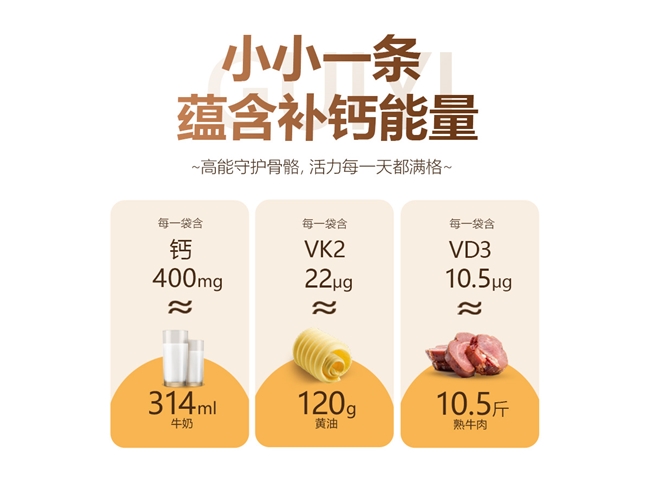 以4.0微米柠檬酸钙为核心钙源,搭配每支400mg高钙,同时辅以专利维生素D3(10.5μg/支)与专利维生素K2(22μg/支,MK-7型),构建起“钙+D3+K2”黄金营养三角,全面覆盖“钙补充-促吸收-定沉积”全补钙链路。其中,MK-7型维生素K2拥有约72小时长效半衰期,可持续引导钙离子定向沉积至骨骼,避免钙异常沉积于血管壁等软组织,从根源解决传统补钙“补而不吸、沉积不佳”的痛点;4.0微米超微粉碎工艺让钙源无需胃酸分解,直接被人体吸收,无任何肠胃负担,适配肠胃敏感人群。所有成分均经过严格甄选,通过专利技术提取,全程锁住成分活性、保障补钙效果;产品规格为15ml*30支,采用独立小支真空密封设计,既能留存成分活性,又能精准控制每日用量,便捷又卫生。